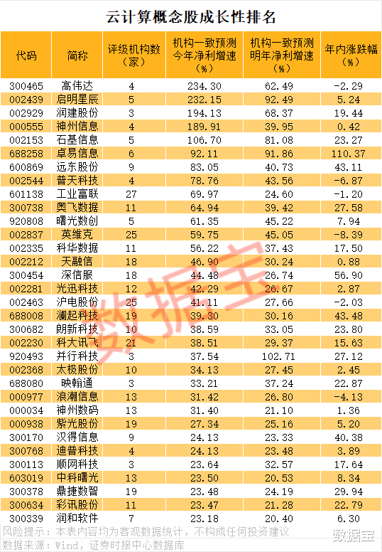 从成长性来看,根据机构一致预测,3家及以上机构评级的云计算概念股中,剔除2025年预亏以及机构一致预测2025年亏损的公司后,有33只个股今明两年净利增速均超20%。其中,高伟达、启明星辰、润建股份、石基信息、卓易信息等个股机构一致预测今明两年净利增速均超50%。